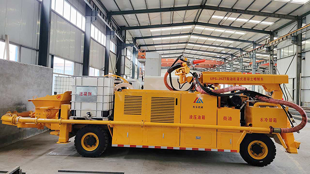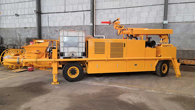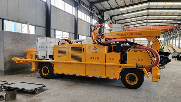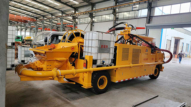 3.車載式濕噴臺(tái)車配有自動(dòng)潤滑系統(tǒng),對主要密封部位采用自動(dòng)潤滑,油脂加注量、加注時(shí)間自動(dòng)控制,大大延長易損件壽命。速凝劑添加連續(xù)可調(diào),可根據(jù)噴漿量調(diào)節(jié)。